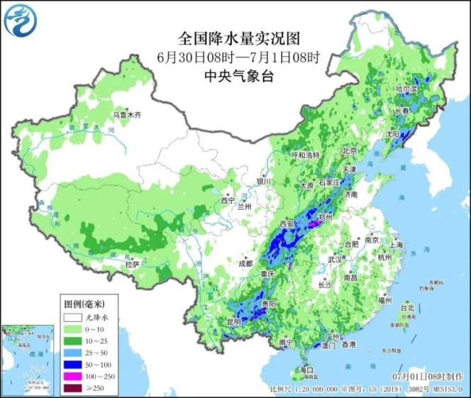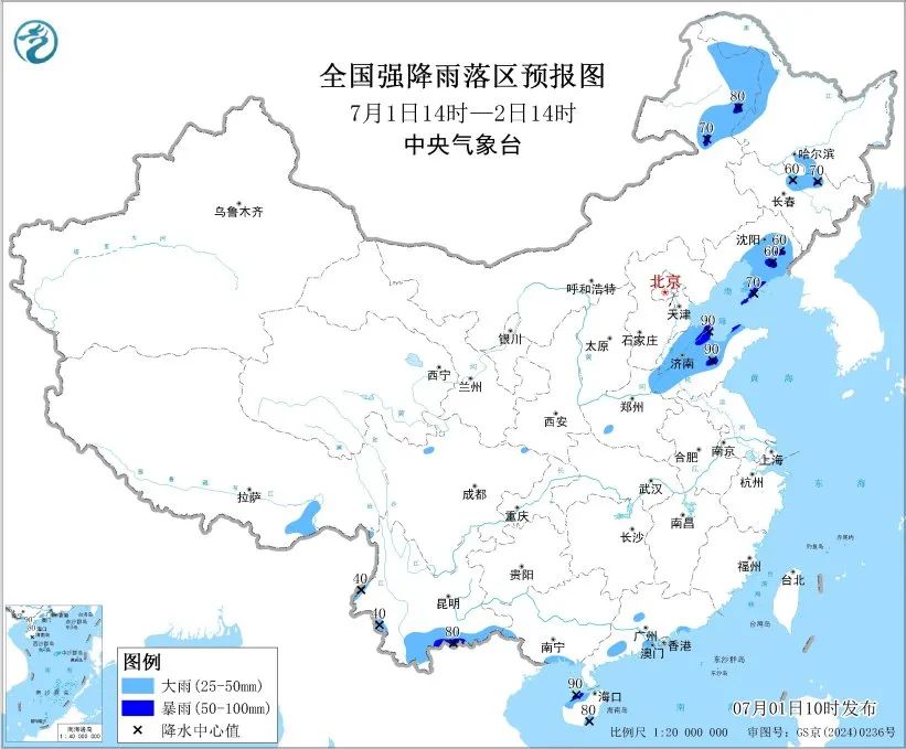 其中今天(7月1日),较强降雨区较为分散,内蒙古东部、黑龙江南部、吉林北部、辽宁中东部、河北东部、天津南部、山东北部、河南西部和北部、云南南部、广西西部和南部、海南岛等地部分地区有大到暴雨,山东北部、海南岛西部等地局地有大暴雨(100至120毫米)。上述部分地区伴有短时强降水,局地有雷暴大风等强对流天气。中央气象台7月1日10时继续发布暴雨蓝色预警。