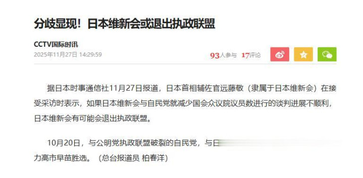 维新会内部早有人不安,他们担心的不是眼前的评分,而是历史之后会怎么记这段时间。如果高市早苗继续在危险边缘乱跳,他们成为她的合作方,难免要被扣上标签。换句话说,他们想离开,不只是政治利益考虑,更是一种自保。